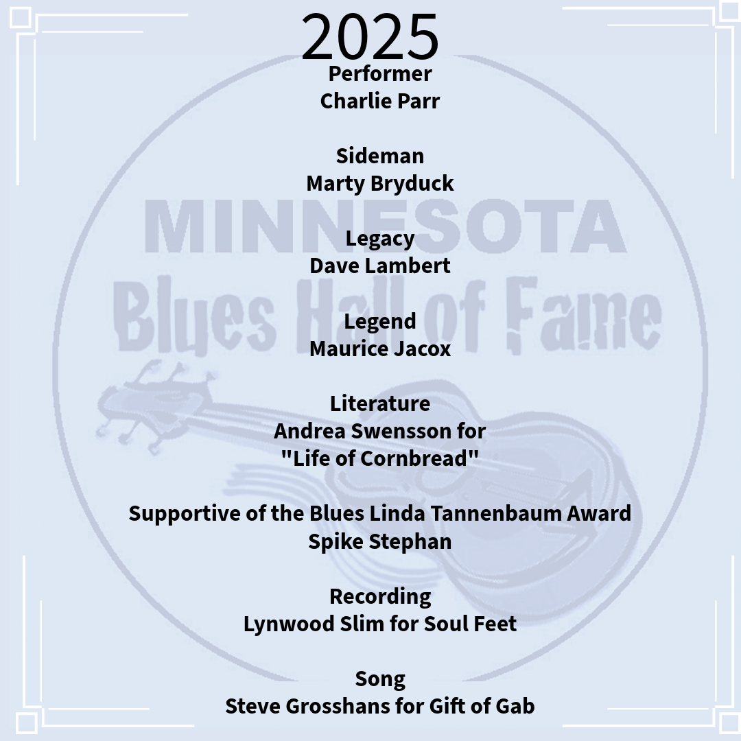 2025 at Jimmy's Event Center Blues Performer: Charlie Parr Blues Sideman: Marty Bryduck Supportive of the Blues (Non-Performer): Spike Stephan Blues Song: "Gift of Gab" - Steve Grosshans Blues Recording: Soul Feet - Lynwood Slim Arts, Literature and Media: Andrea Swensson for "Life of Cornbread" Blues Legend: Maurice Jacox Blues Legacy: Dave Lambert